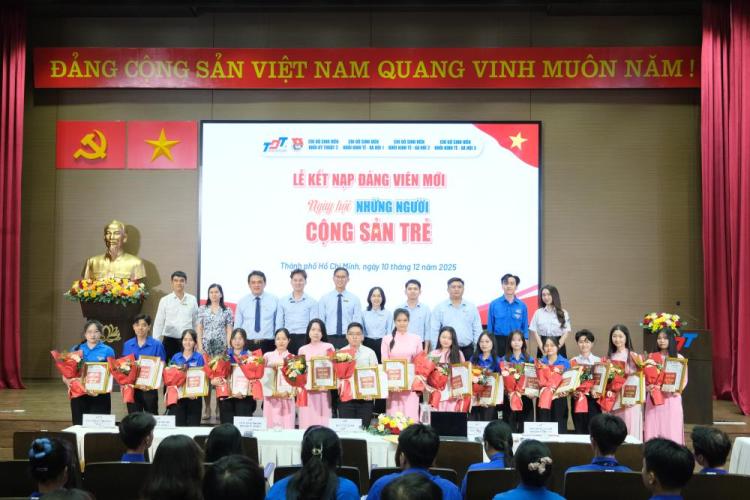 Ngày 10/12/2025, Đoàn Thanh niên – Hội Sinh viên Trường Đại học Tôn Đức Thắng (TDTU) đã phối hợp với các cấp ủy Chi bộ sinh viên trực thuộc Đảng bộ Trường tổ chức Lễ kết nạp Đảng viên mới cho 15 đoàn viên ưu tú đến từ các khoa: Toán – Thống kê, Kỹ thuật Công trình, Công nghệ Thông tin, Tài chính – Ngân hàng, Quản trị Kinh doanh, Khoa học Xã hội và Nhân văn và Ngoại ngữ.